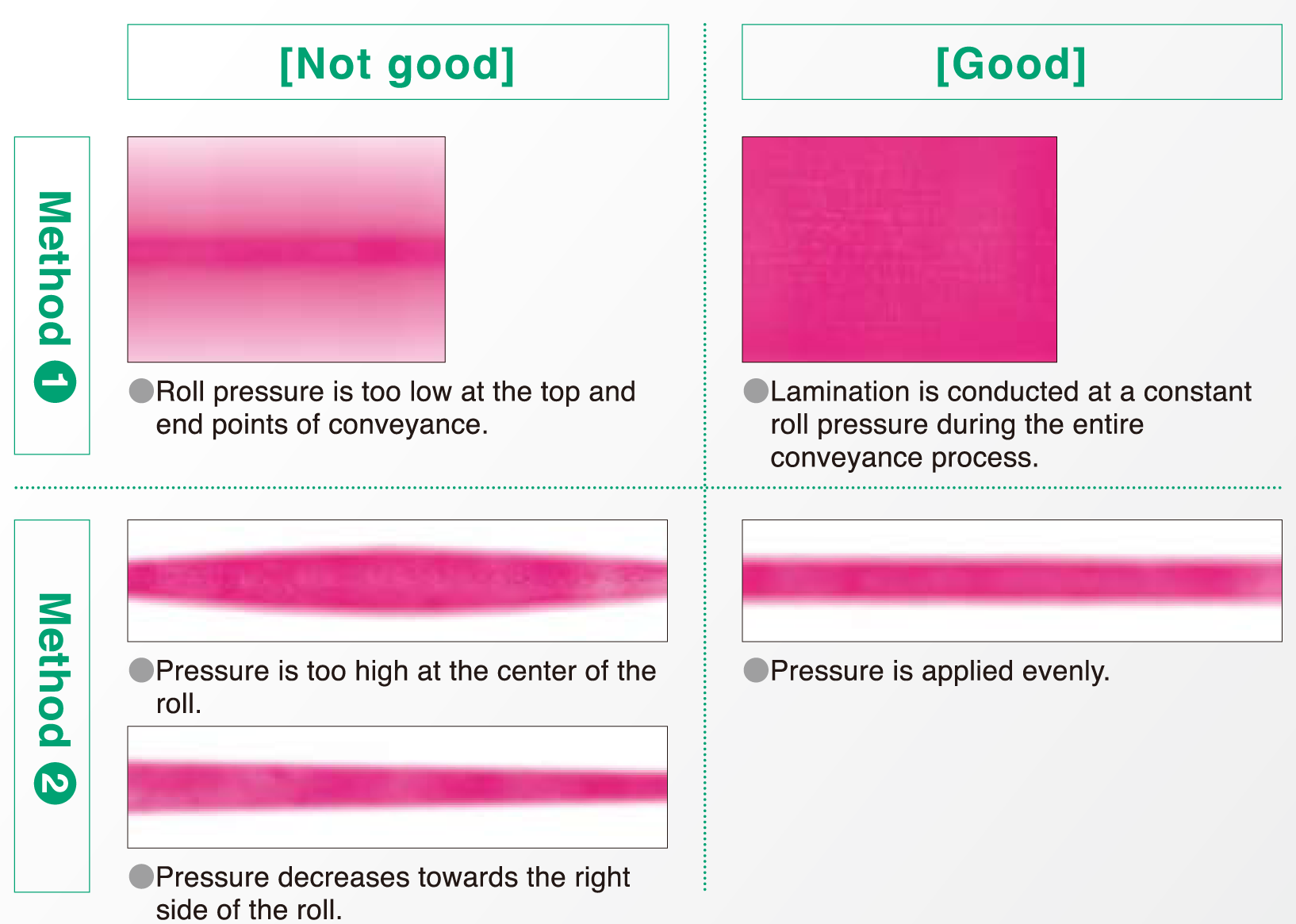 According to the coloring of the Prescale; check whether or not the pressure of the lamination roll is applied uniformly and at the prescribed value.