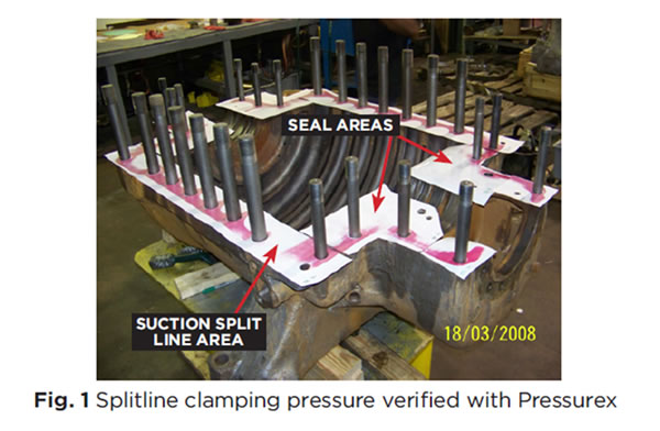 The shades of red can be compared to a color chart provided with the Pressurex that relates the shade of red to the clamping pressure. For this application the medium grade Pressurex, was utilized which captures contact pressure between 1,400 PSI to 7,100 PSI. The upper half compressor case was installed on the lower half and the bolting was torque to original equipment manufacturers (OEM) specifications. After thirty minutes the top half was removed and the Pressurex was inspected to determine the condition of the splitline sealing surface and the splitline contact in the sealing area. The test showed there was little, if any clamping pressure in several areas. The seal areas and two other areas on the split line on the suction end indicated that there was less than 1,400 PSI clamping pressure in these areas. (Fig.1)