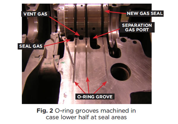 The deficiencies at both the seal and suction area splitline were addressed by machining O-ring grooves in the bottom half of the compressor case. The machinery Owner and the Becht advisor decided on the location and size of the O-rings installed. The seal splitline O-rings grooves were machined close to the inner edge of the seal gas port lands then extending radially outward toward the splitline bolting where acceptable clamping pressure was confirmed by the Pressurex (Fig. 2). This modification will prevent leakage gas from entering the vent gas port, the separation gas ports and the atmosphere on the new dry gas seal installation.