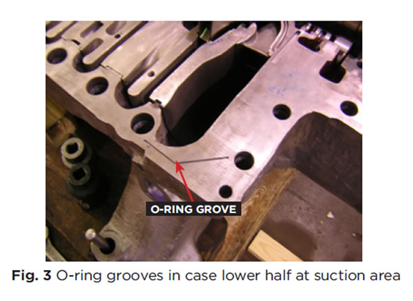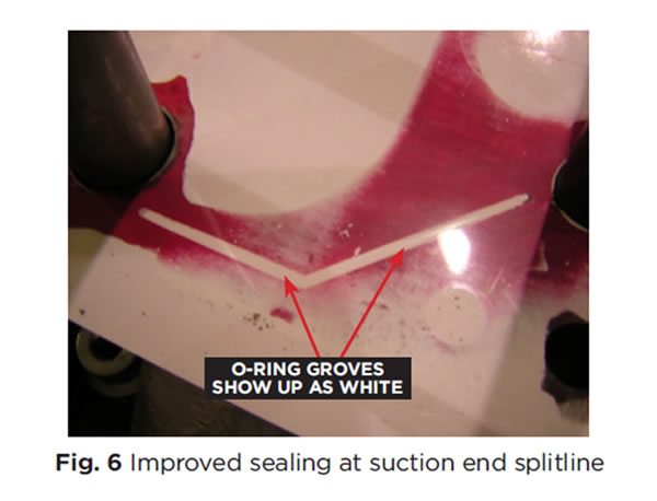 In the area of minimal clamping pressure on the suction end splitline, O-ring grooves were machined in the splitline to prevent internal leakage across the splitline. These grooves were machined from areas of acceptable clamping through areas of minimal clamping then terminating once areas of good clamping pressure were reached. (Fig. 3)