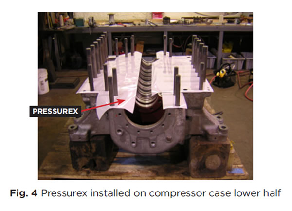 After all the repairs were completed on the compressor cases, the diaphragms and IGVs were adjusted for correct fit and installed. Pressurex was installed on the entire split line to check for acceptable clamping pressure and possible interference with the diaphragms or IVGs at the splitline. (Fig. 4)