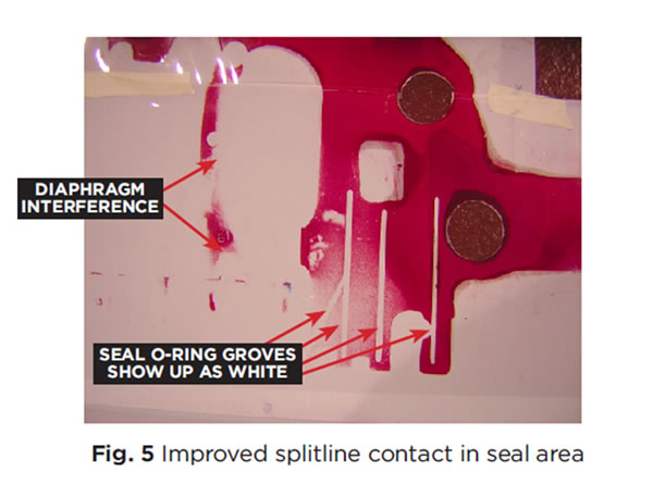 The seal o-ring groves did extend into an area of acceptable clamping force as did the suction end o-ring. The improvement of the splitline contact (Fig. 5) is a result of surface grinding both the top and bottom halves of the compressor case. Notice the red impression to the left of the seal housing where the Pressurex indicated that the bottom half of the first diaphragm had an interference fit to the top half of the first diaphragm. This would have prevented the casings from sealing which would result in a leaking splitline in that area. The diaphragms were modified to insure proper clearance between the top and bottom halves. The suction end splitline o-ring groove now had sufficient clamping force on both ends which should prevent leakage in this area. (Fig. 6)