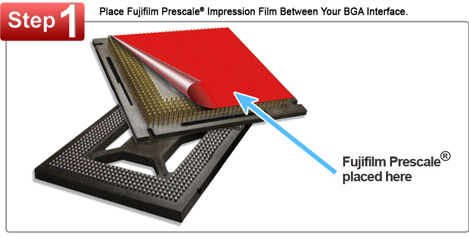 When placed in your interconnect interface, the film instantaneously and permanently changes color in direct proportion with dimensional uniformity and out-of-plane conditions. Detecting missing, damaged, and out-of-position balls is easily determined by comparing the resultant color intensity to a standardized color correlation chart. No training or instrumentation is required.