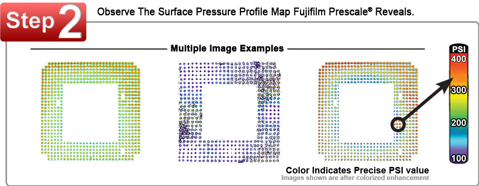 Fujifilm Prescale® sensor film reveals both pressure distribution and magnitude between contacting surfaces in a dramatic surface "map."