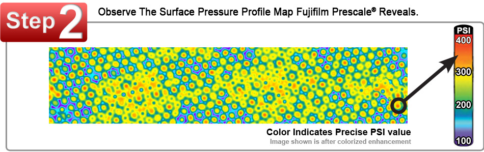 Fujifilm Prescale® sensor film reveals both pressure distribution and magnitude between contacting surfaces in a dramatic surface "map."